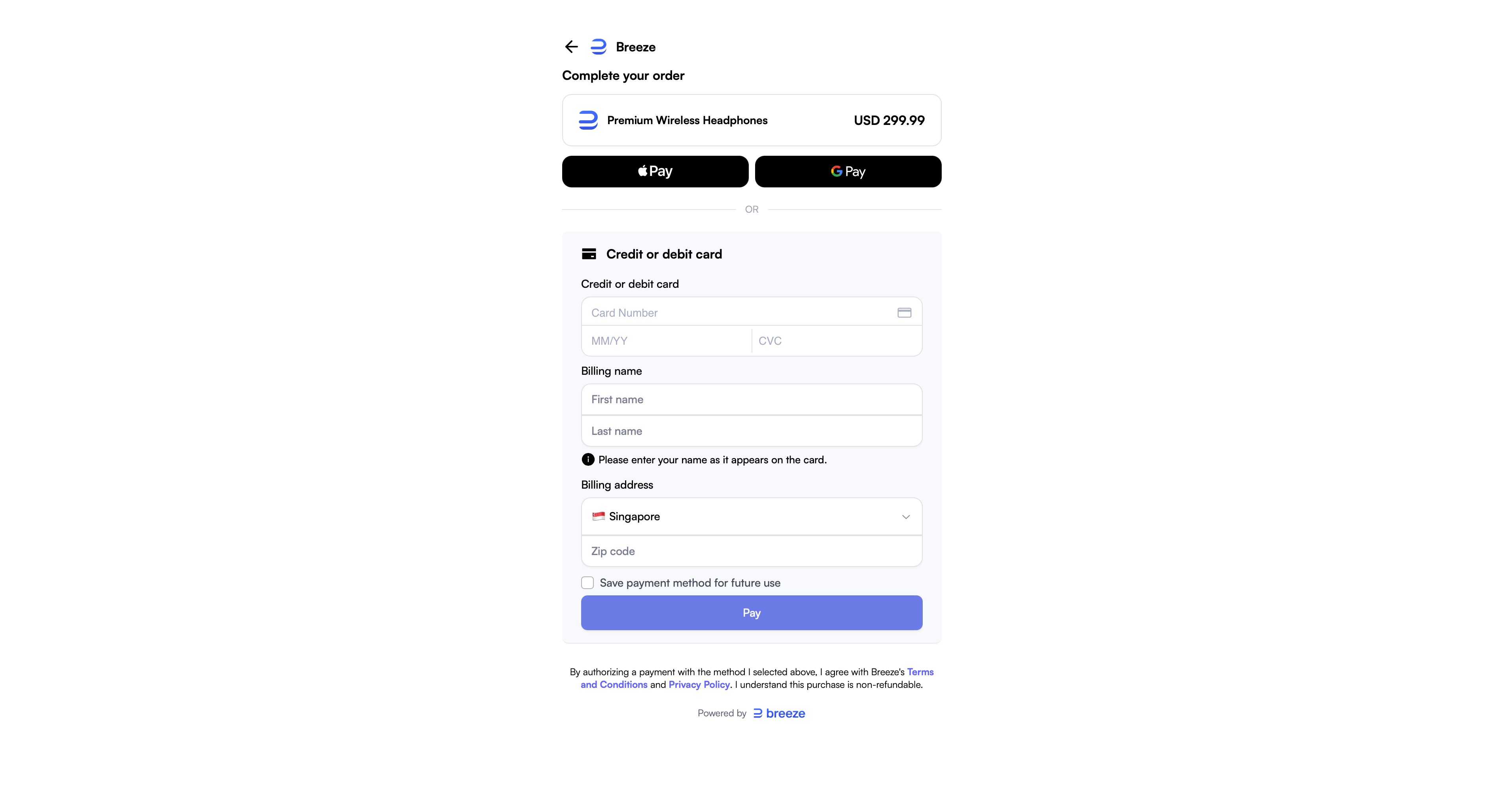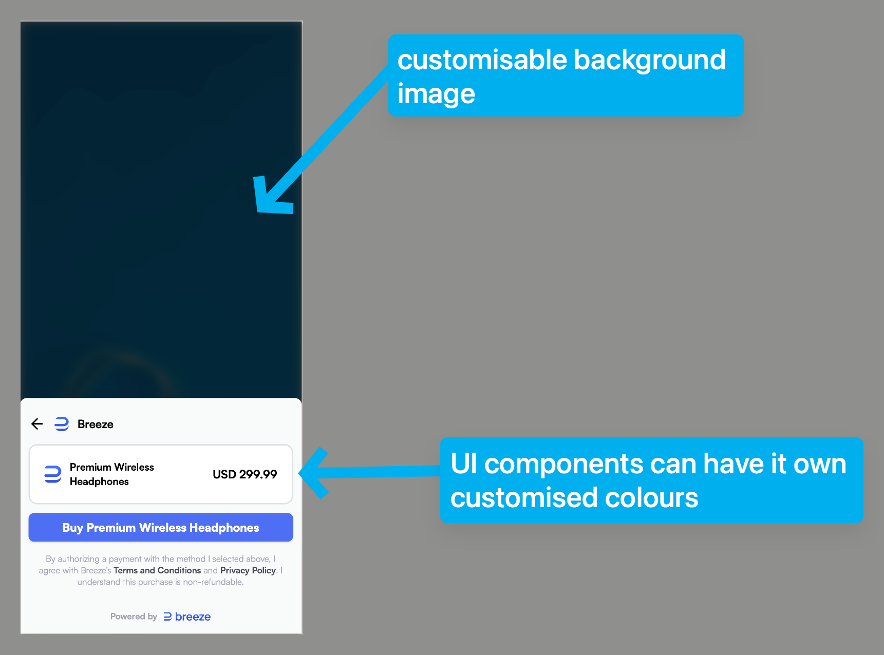 Breeze lets you customize the Payment Page UI based on the context, whether it's an in-app purchase or a standard web checkout, giving you flexibility and maximising conversions.