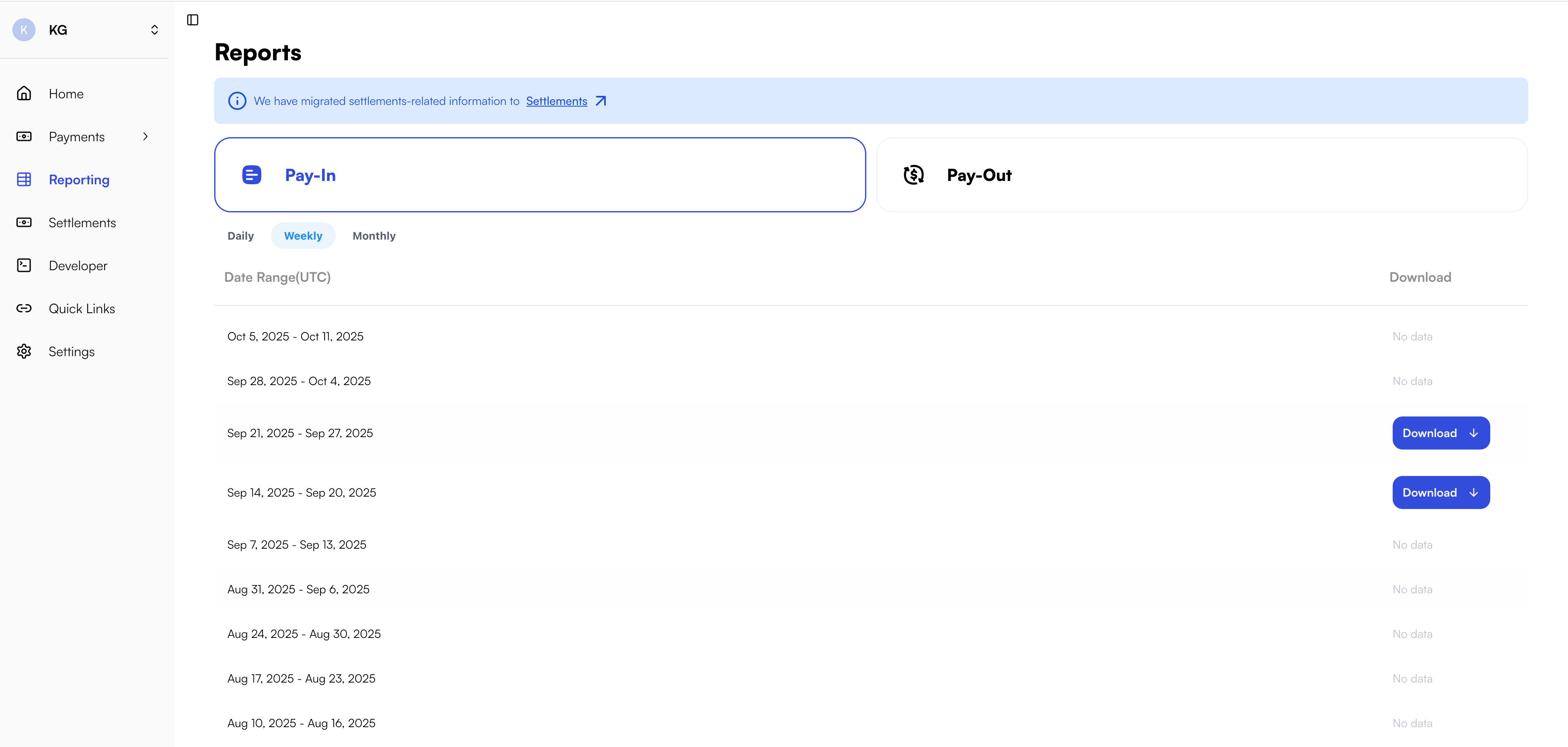 Navigate to https://dashboard.breeze.cash/reports and download the files you want(crypto pay-in statements will be available in dashboard soon)